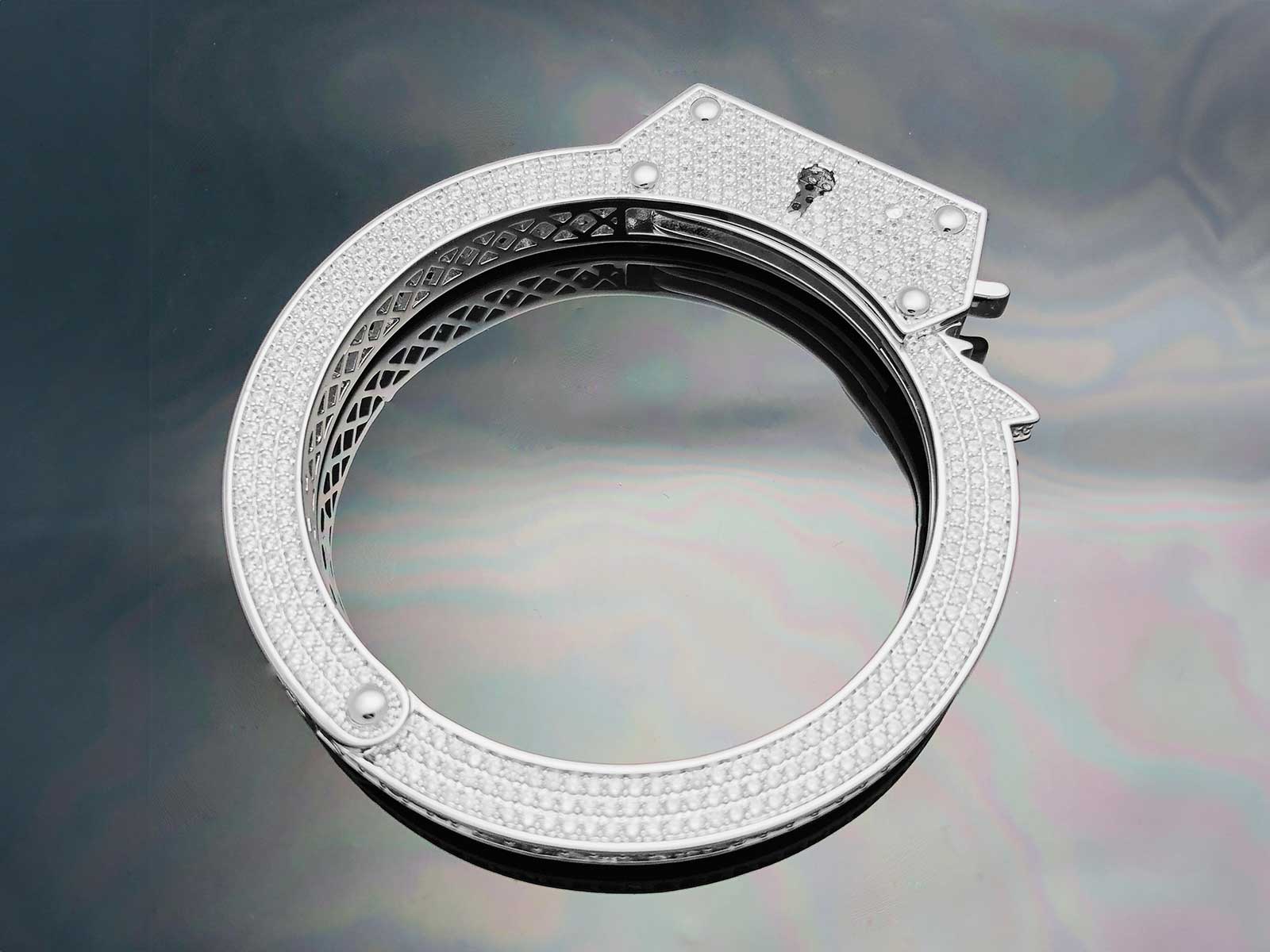 The bangle opens and closes via a side push-button clasp and is slightly adjustable in fit. The compact cuff design is accented with micro-set brilliant-cut stones, wrapping seamlessly around the wrist with full side detailing for elevated shine from every angle.
