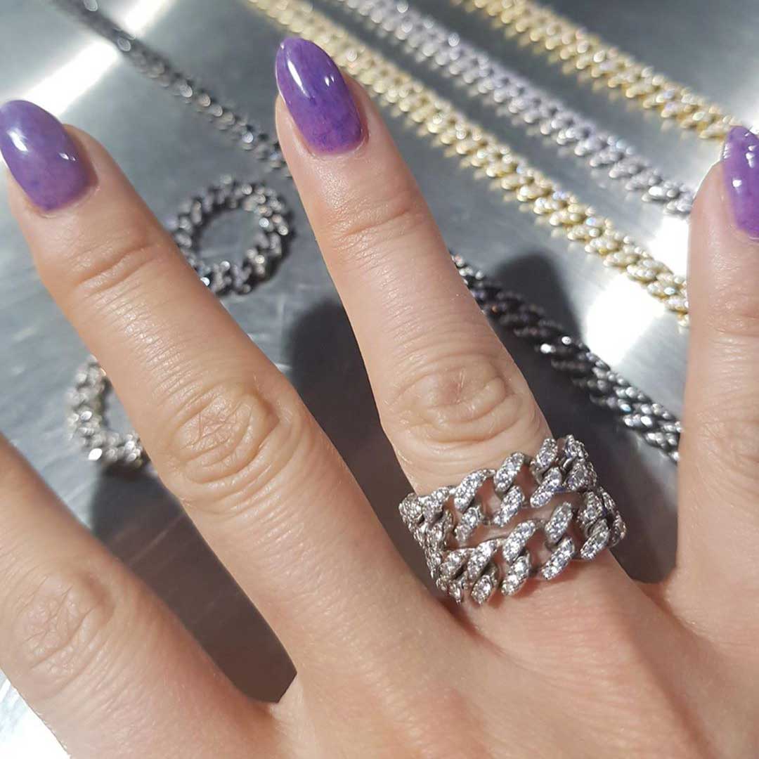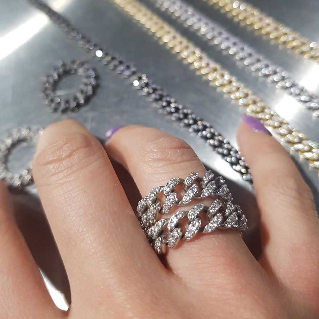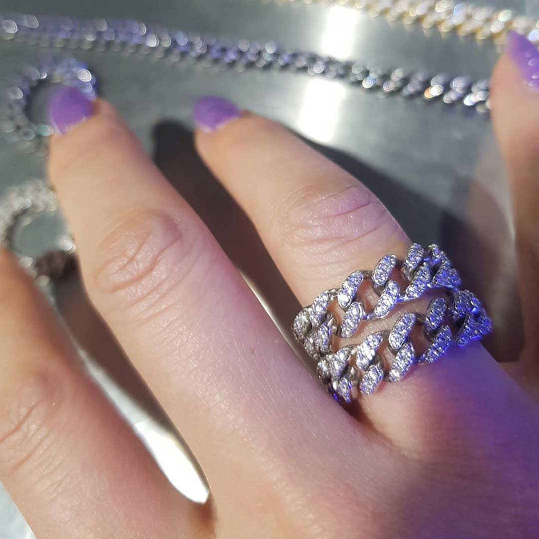 Every ₩OOING piece is handmade by expert artisans. Unlike low-grade accessories where stones are glued, each brilliant-cut stone is securely prong-set by hand, ensuring durability and a flawless luxury finish. The Cuban links form a continuous flow, wrapping naturally around the finger without twisting or breaking its elegant line.