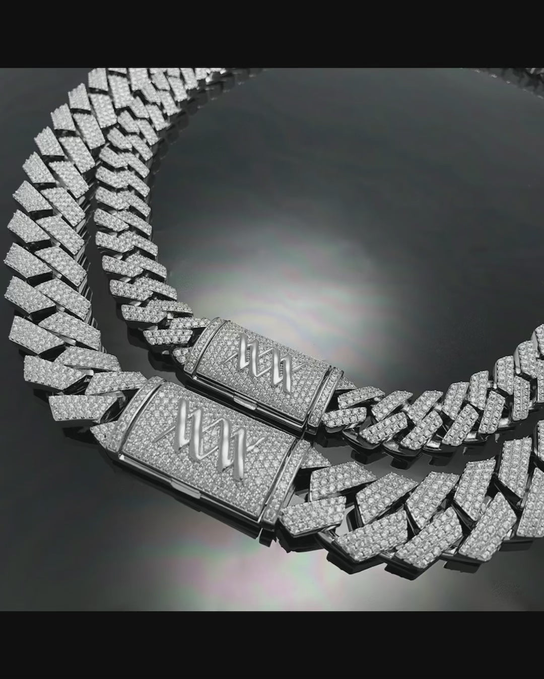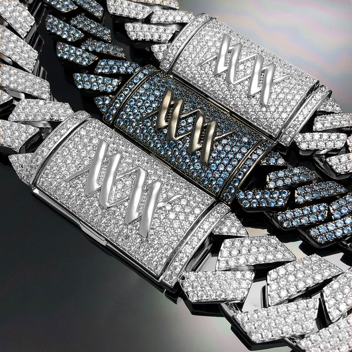 여타 쿠반체인 에 비하여 직선의 각진 형태의 디자인으로 만들어진 마이애미큐반 제품으로, 두께감이 있는 쿠반링크 윗면에 작은 밀리 사이즈 다이아몬드 시뮬런트 스톤들을 세팅하여 디자인한 쿠반체인 입니다.  우잉의 주얼리는 얇고 가볍게 만들어져 잘 뒤집어지는 저렴이 악세사리 쿠반과는 확연히 차이가 있는 두툼한 두께감으로 제품이 뒤집어지지 않도록 무게감있게 목과 팔목을 감싸는 형태로 안정감 있는 착용감을 주며, 각 쿠반링크에 다이아몬드시뮬런트 스톤들을 섬세하게 핸드 세팅한 제품입니다.