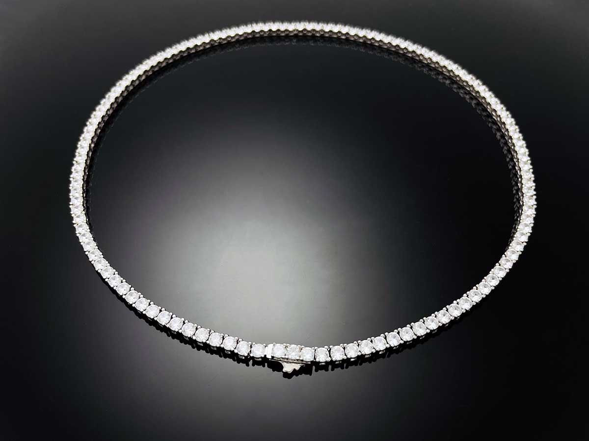 테니스 체인은 본래 "Eternity Bracelet" 또는 "Eternity Necklace"라고도 불리는데, 이터니티 주얼리의 유래는 스포츠 역사상 가장 뛰어난 승률을 기록한 여성 테니스 스타 크리스 에버트의 1987년 US 오픈 경기와 관련이 있습니다. 에버트가 항상 차고 경기에 임하던 화려한 다이아몬드 팔찌가 경기 도중 끊어져 코트에 흩뿌려지면서 경기가 중단되었고, 그 후 이와 같은 배열의 형태가 테니스 팔찌/목걸이의 이름으로 유명해졌습니다.